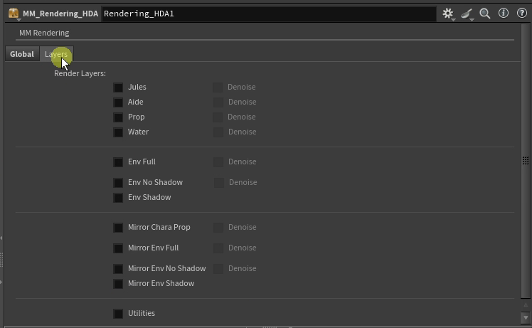 – The artist can choose to send different render layers, partially procedurally made via the bundles set up in Houdini and different ris nodes. They can also choose for each pass to have a denoised version or not.